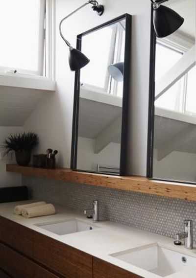 Безусловно, главным атрибутом любой ванной комнаты является зеркало, особенно в современном оформлении оно широко используется не только по прямому своему назначению, но и в качестве выгодного дизайнерского решения. Современному дизайну зеркал свойственна сдержанность и лаконичность во внешнем виде, более преобладают выдержанные и четкие геометрические фигуры. Также довольно популярной стала тенденция отсутствия обрамления у зеркал, а еще лучше, чтобы они были смонтированы как часть стены или даже потолка.