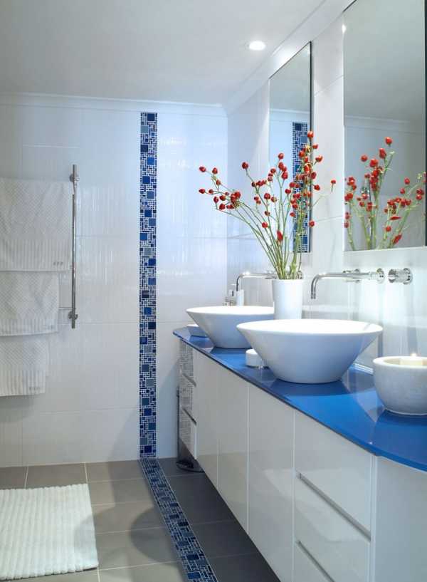 Популярный ход – цветные акценты на стенах или на полу. С этим поможет, например, яркая современная плитка для ванной комнат
