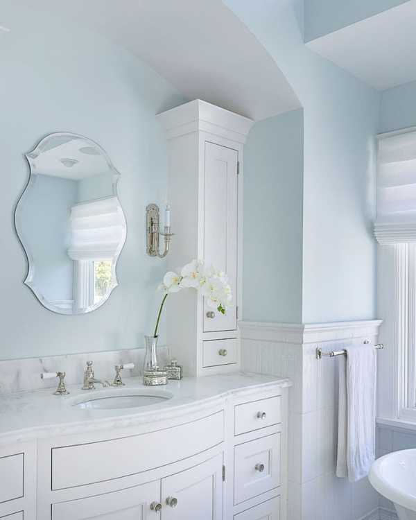 Особое внимание стоит уделить сантехнике и мебели. Ванна на роскошных ножках, миниатюрные комоды в пастельном цвете, легкий голубой оттенок для стен повышают настроение и добавляют нежности