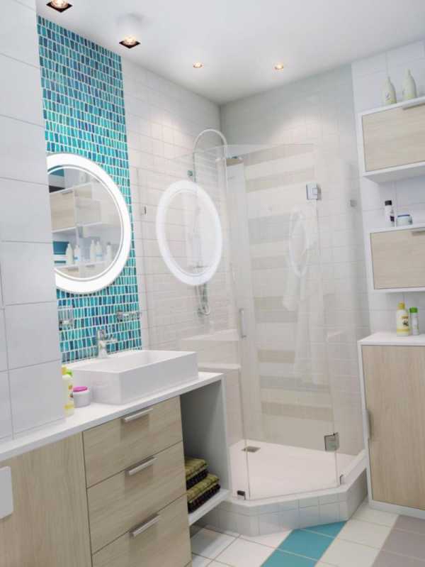 Если вы решили оборудовать ванную душевой кабиной, цвет перегородки тоже должен быть светлым. Чтоб дизайн не казался скучным, можно выбрать модный вариант с фото печатью на материале перегородки. Над кабиной при желании устанавливаются дополнительные источники освещения, что визуально расширяет помещение.