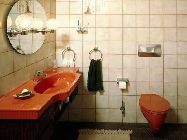 Цвет отлично гармонирует с трубами из хромированных материалов и обыкновенным сантехническим оборудованием белого цвета. Лучше всего оранжевый цвет подойдет в просторную ванную или туалет.