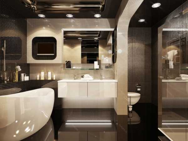 Такой дизайн ванной комнаты увеличивает пространство. Поэтому выигрышно смотрится в малогабаритных помещениях и рекомендуется для использования. Пространство не только расширяется, но и становится выше. Габариты комнаты не оказывают никакого влияния.