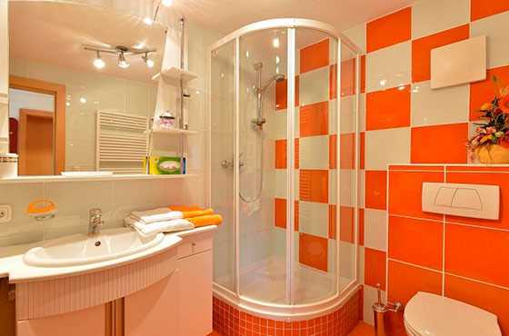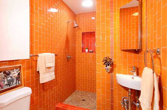 В ванной комнате хорошо смотрятся яркие стены. Насыщенные оттенки позволяют создать всплеск эмоций в помещении. Оно станет своеобразным островком позитива, где можно зарядиться энергией и хорошим настроением. Для такого дизайна отлично подойдет оранжевый с фиолетовым, красные стены с зелеными акцентами. Разбавить сочные цвета можно белым кафелем.