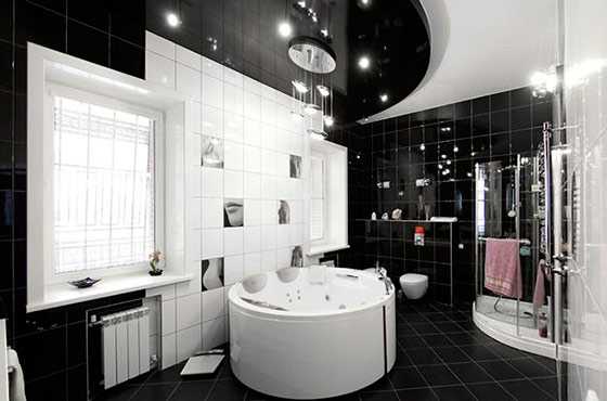 Данный вариант дизайна ванной комнаты подходит не всем помещениям. Так как он визуально уменьшает пространство. Если площадь его небольшая, то подобное оформление сделает его миниатюрным. Избавиться от подобного эффекта помогут вертикальные полоски. Уместно их использование вокруг умывальника или стиральной машины. Яркая полоска украсит интерьер, сделает пространство объемнее.