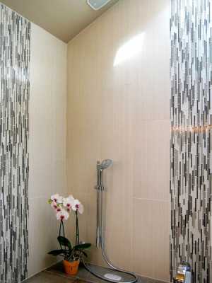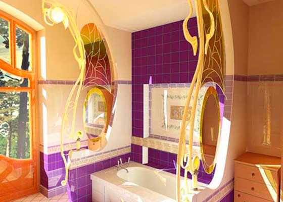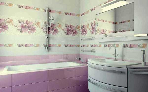 Зачастую используются плитки в цветах. К примеру, если Ваша гигиеническая комната оформляется в фиолетовые оттенки, плитка может быть в фиалках или лаванде. Очень оригинальное сочетание фисташкового или персикового с фиалковым.