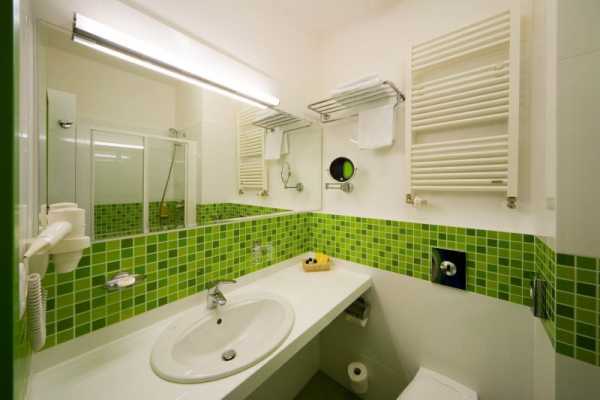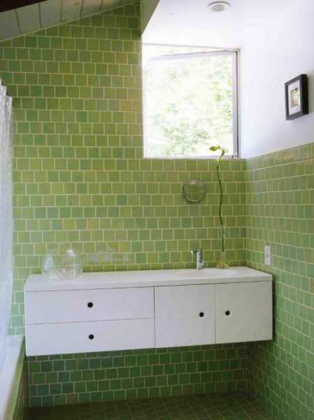 Это прекрасный аналог синему или голубому. Зеленый – это спокойный и размеренный цвет, дарящий гармонию. Если оформление однотонным зеленым для Вас покажется скучным, можете повесить в ванной занавеску, например, с лягушками. Тогда интерьер будет гораздо озорнее и веселее!