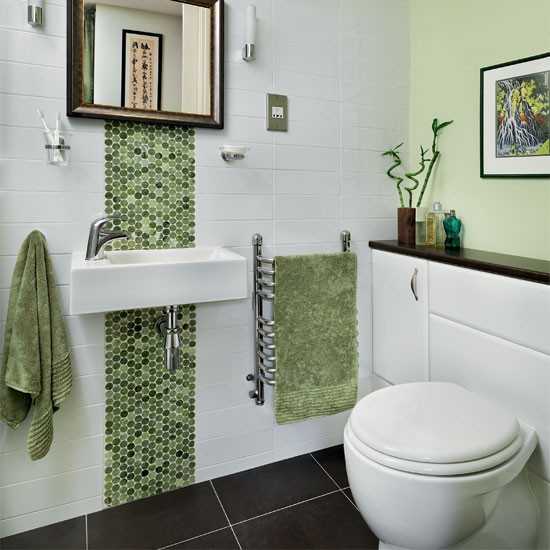 Оригинально и современно смотрится мозаика. Данный вид плитки подходит для обустройства малогабаритных комнат. Его можно сочетать с обычным кафелем. Главное правильно подобрать цвет.