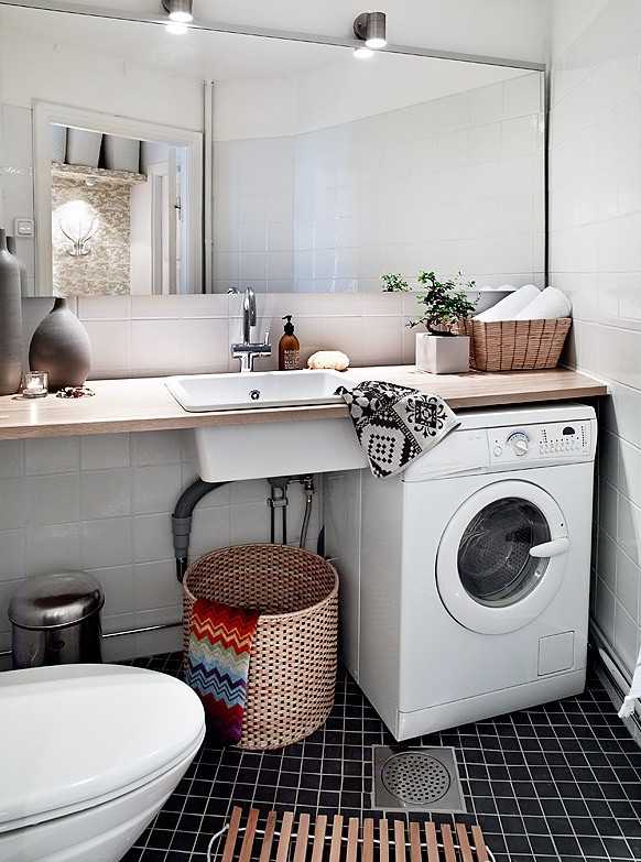 Обычно дизайн планируют вместе со стиральной машиной. Ее можно поставить под раковину или отдельно. Хорошим вариантом для просторного помещения станет большая тумбочка с раковиной и столешницей с местом под стиральную машину.