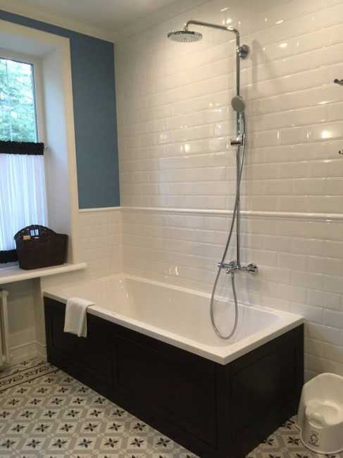 - Для тех, кто любит купаться долго и с наслаждением, душевая кабина вряд подойдёт. В этом случае под обычной ванной делают дополнительные места для хранения, закрыв их декоративной дверцей.