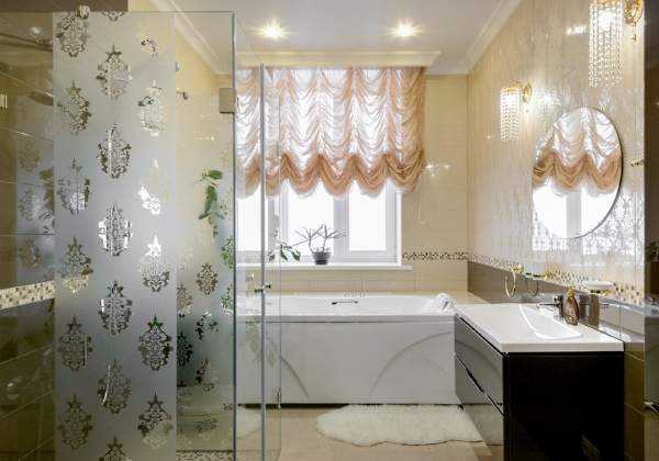- Если будете устанавливать ванную – выбирайте прозрачные занавески или короткие завесы, которые не будут «воровать» пространство пола