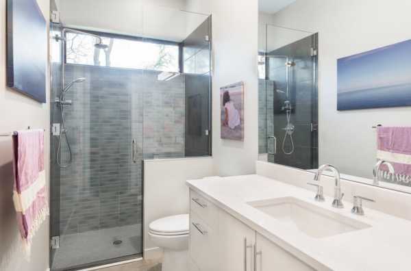 Смелые решения, необычный декор, неожиданные сочетания ярких цветов, форм и фактур – все это свойственно стилю модерн. Пространство ванной комнаты делится на функциональные зоны с помощью стеклянных перегородок и подсветки.