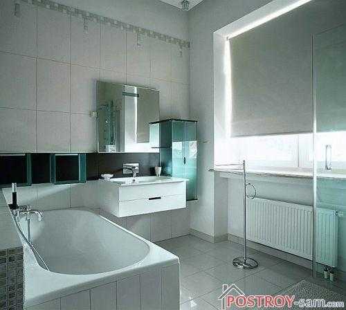 - Интерьер средней ванной комнаты – такая комната может быть совмещена с санузлом, и создать здесь современный дизайн не составит труда. Главное – сразу определить стиль помещения и правильно расставить мебель и технику. В такой ванной лучше всего использовать контрастное цветовое оформление – нижняя окантовка может быть выполнена в ярком цвете – от смелого розового до ярко-зеленого, а верхнюю часть можно выложить белоснежной керамической плиткой.