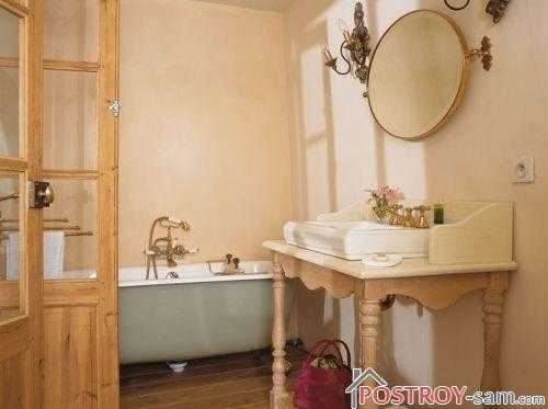 К такой мебели необходимо подобрать соответствующее сантехническое оборудование: раковину, изготовленную из мрамора, меди или фаянса с нанесенной на нее рукодельной росписью, краники из позолоты с вентилями из хрусталя, сделанный под старину унитаз.