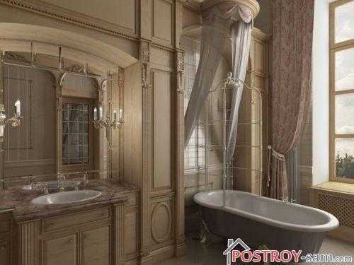 Выбирая сантехнику, предпочтение стоит отдать моделям классической формы, изготовленным из качественного фарфора и оформленным ручной росписью. Этот стиль не терпит встроенной или настенной сантехники. Ванная должна стоять в центре помещения, как было принято в старину.