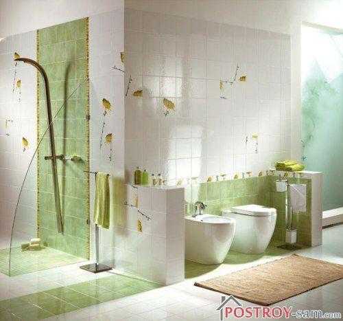 Ванную комнату без туалета можно красиво оформить в золотистых, персиковых, медных терракотовых оттенках. Оказывает успокаивающее действие спокойный голубой тон, а зеленый оттенок может снять напряжение. Если все эти цвета сочетать с белой сантехникой, помещение будет выглядеть уютным, светлым и чистым.
