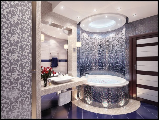 Дизайн угловой ванной комнаты подходит для тех людей, которые любят роскошные и нестандартные решения. В основном они размешаются в угловой части, однако существуют варианты, когда она располагается и в центре.