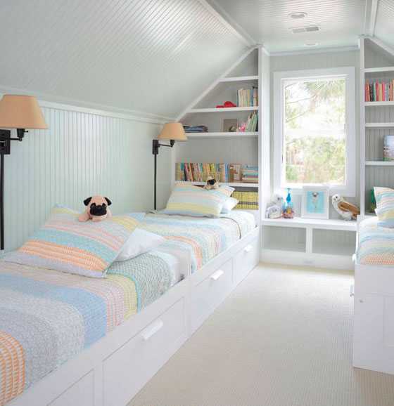 - Кровати можно поставить на возвышение, тогда появится место для хранения книг, постельных принадлежностей и прочих вещей.