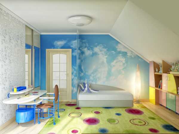Оформляют стены детской на мансарде преимущественно в светлых оттенках, как уже выяснили из-за недостатка солнечного света в дневное время. Но главное при этом соблюдать баланс, нельзя перебарщивать с ними тоже, учитывая то, что комната оформляется для ребенка, нужно в ее интерьер привнести еще и ярких, интересных красок. Это могут быть и разноцветные занавески, цветная мебель, светильники с броским плафонами, красивый разноцветный ковер или просто яркие картинки в интерьере. Это создаст контрастную и жизнерадостную обстановку.