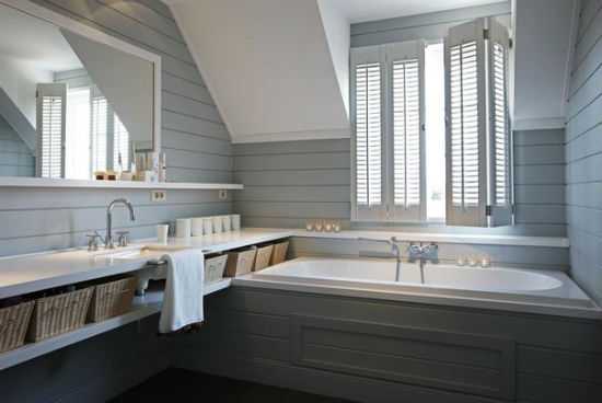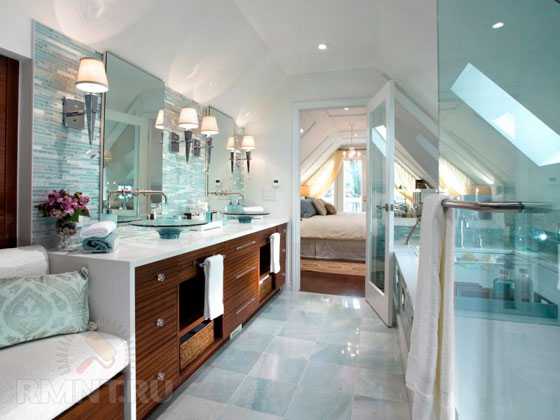Ввиду того, что стены на чердаке косые, необходимо произвести правильное планирование. Как правило ванна устанавливается прямо под скатным потолком. Весьма удобно если над ней будет расположено окно. Принимать ванную и смотреть на звезды или облака — в вечернее время — потрясающее удовольствие.