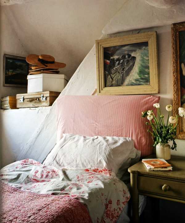 Мансардная спальня может быть украшена разными аксессуарами, создающими единую стилистику для всего интерьера. Вертикальные картины на стенах сделают пространство вашего чердачного дома объемнее и глубже и подойдут для любого дизайна.
