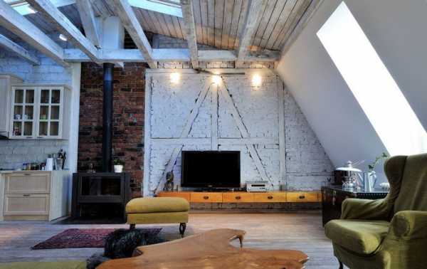 Если же на чердаке имеется фронтальная стена и она из кирпича или камня, не нужно ее прятать. Достаточно ее очистить от пыли и покрыть специальным раствором, чтобы облагородить. Тогда она станет визитной карточкой гостиной чердачного стиля. Лофт — прекрасная идея, которая на 100% впишется в гостиную на мансарде.