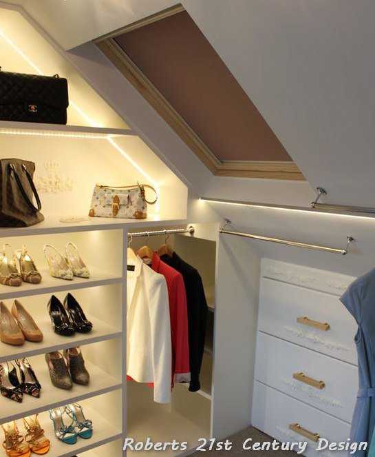 По умолчанию чердак всегда становится местом для хранения уже отживших свое вещей, которые вроде еще и неплохо сохранились поэтому жалко выкинуть. Но как показывает практика, все равно они со временем будут выброшены или кому-то отданы. Поэтому почему бы не ускорить этот процесс. Чердачную кладовую освобождаем от старого, пыльного «барахла», а на ее месте выстраиваем полноценную функциональную гардеробную. Она на намного будет полезнее, место не будет зря пропадать и будет чистота и порядок на чердаке. И самое главное сэкономится место в доме, ведь не всегда удается разместить полноценную гардеробную в спальной и тем более в отдельной комнате дома.