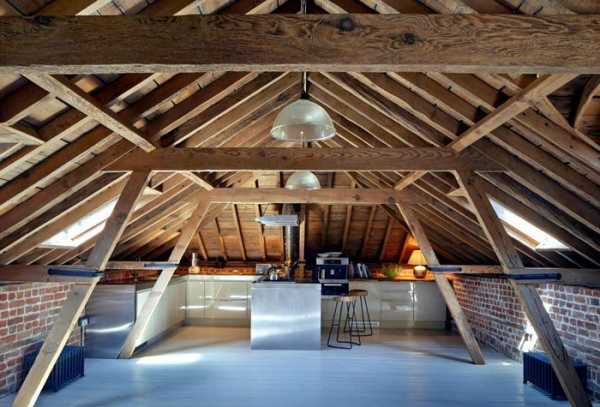 Если мансарда будет оформлена в стиле лофт, где нет места излишествам, только свобода и воздух, то логично вертикальные балки и стропила кровли оставить в первоначальном виде или выкрасить в монохромный цвет, это подчеркнет строгость форм и лаконичность дизайна.