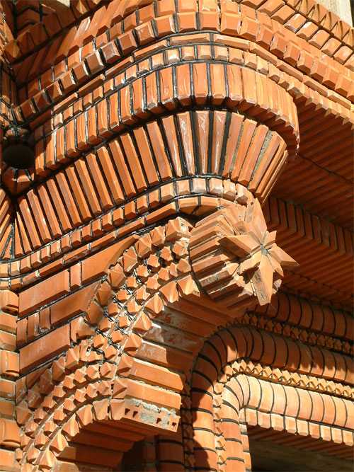 Образец фасада из кирпича: кладка, украшенная полиуретановой лепниной- Но выполнить такую работу дилетанту не под силу, а услуги мастеров подобного уровня, которых ещё не так-то легко найти, стоят недёшево. Гораздо проще взять фасадный фактурный кирпич, который и сам по себе очень красив, и, облицевав им фасад, украсить его белоснежной полиуретановой лепниной, как это сделано на вышеприведённом примере.