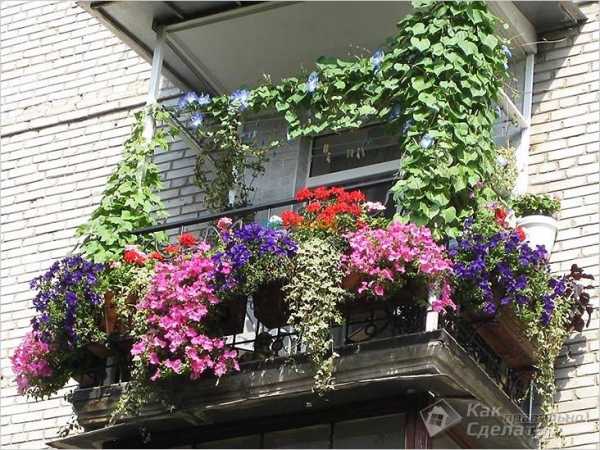 Вьющиеся растения превратят балкон в обильно цветущую садовую беседку или обвитый плющом некий английский дворик. Кроме того, в соседстве с плющом будут выгодно смотреться разноцветная петуния и другие яркие цветы.