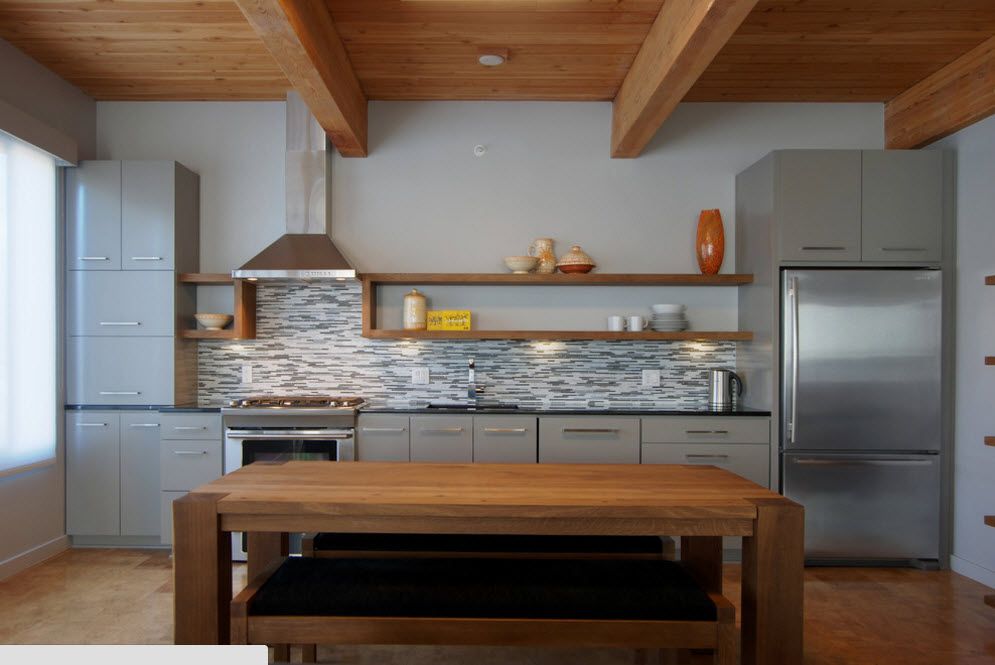 В современных интерьерах оформление кухни плиткой встречается все реже, так как такой вариант уже вышел из моды. В основном ее применяют для отделки рабочего фартука или некоторых рабочих зон. Виды керамической плитки очень разнообразны, каждый сможет выбрать вариант по своему вкусу: глянцевая, текстурная, гладкая, матовая. Однако использование плитки на кухне не лишено минусов: в межплиточный шов забивается грязь, которую сложно вычистить из столь труднодоступного места. Поэтому в качестве рабочего фартука все чаще используют специальные панели или стекло (см. фото).
