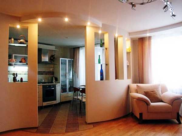 Перегородка, которая разделяет кухню, коридор и гостиную – самая большая. Она является регулируемым элементом в ходе изменений. Если вы хотите в ней пробить арку, то интерьер становится весьма необычным.