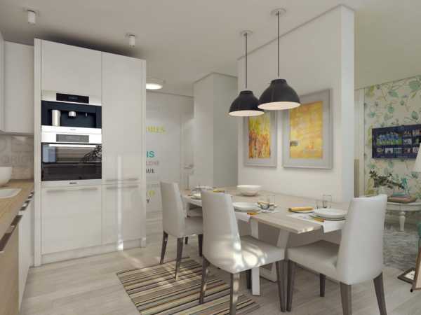 - Во-первых, можно выбить стену, разделяющую кухню и комнату и таким образом превратить место для приготовления и принятия пищи в кухню-столовую. Но такой выход семейным парам с детьми придется не по душе. Все-таки на одну комнату становится меньше, а это является критичным моментом.