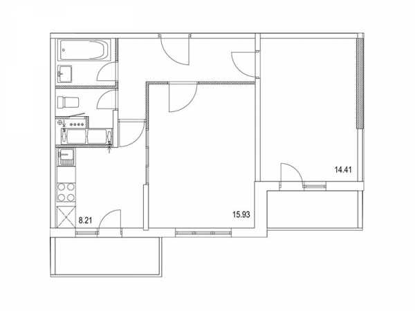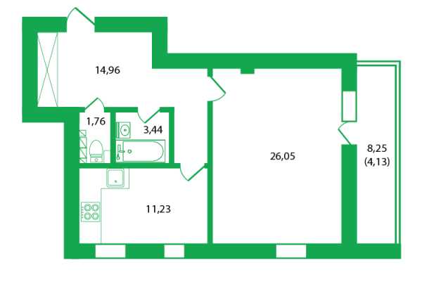 5. Плохая инсоляция помещений. От недостатка света могут страдать просторные комнаты, в которых единственное окно загорожено лоджией, квартиры с недостаточным количеством окон или помещения нестандартной формы. Например, в планировочном решении ниже пятиугольная кухня имеет только выход на балкон, и других источников естественного света в помещении площадью почти 15,5 кв.м не предусмотрено. Если балкон застеклить, солнца будет ещё меньше.