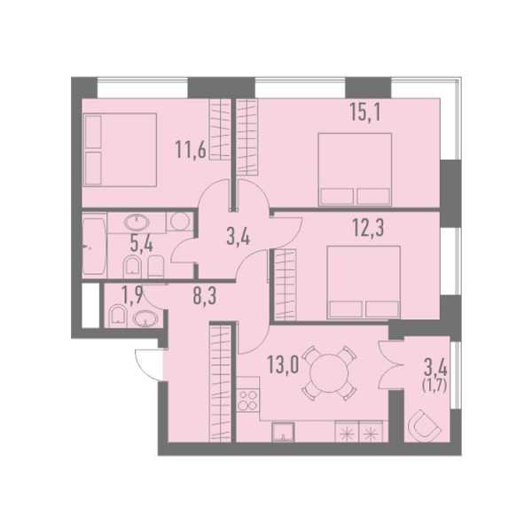 В двух- и трёхкомнатных квартирах санузел должен быть раздельным или должна быть техническая возможность его разделить. Например, в квартире ниже это можно осуществить, только пожертвовав кладовой. Что, естественно, не добавит планировке функциональности. Тем более, что конфигурация коридора не позволяет разместить даже шкаф.