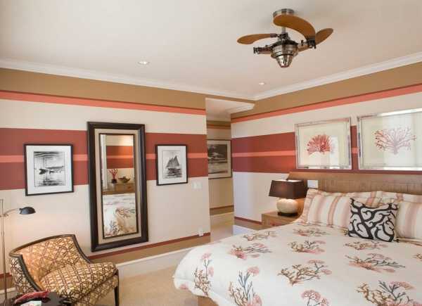 - Оригинальной идеей считается использование чередующихся полос. Декоративные орнаменты сочетаются с основным фоном. В помещении с белыми стенами используются полосы цветной палитры или ахроматическая гамма. Бежево-коричневое помещение дополнят красные, зеленые и синие цвета.