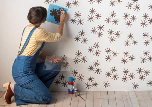 Декоративное окрашивание стен с помощью трафаретаИнтересного результата можно добиться, если использовать краскопульт. В этом случае трафарет должен быть выполнен из жесткого материала, он не наклеивается на стену, а держится на некотором удалении. Рисунок получается расплывчатым. Такой метод подходит, когда основа еще не высохла.