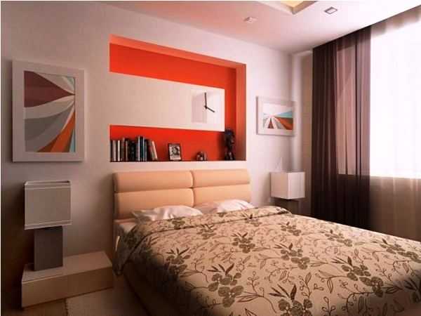 Декор маленькой спальни, фотоДобавив встроенный стеллаж или нишу, вы получите прекрасную экономию площади, функциональную часть комнаты и отличное место для хранения всевозможных предметов и аксессуаров. Наличие полочек избавляет от необходимости устанавливать дополнительную мебель.