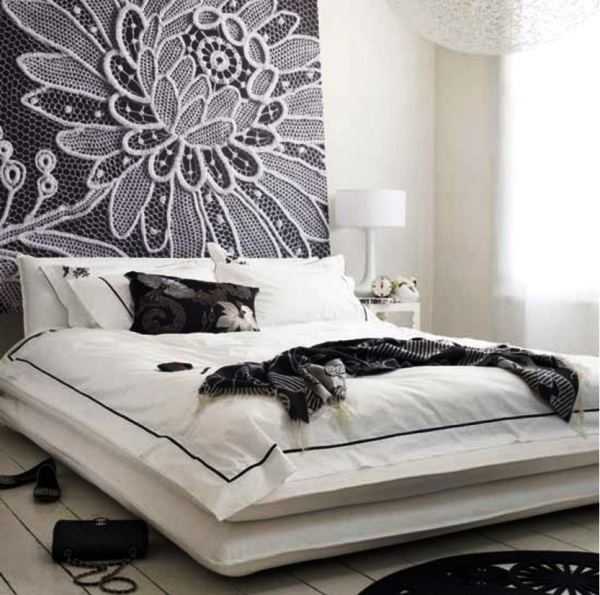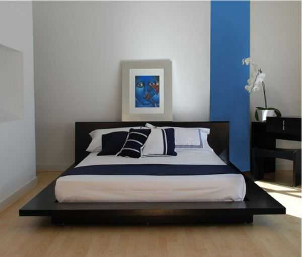 Кровать без изголовья – верный способ придать своей спальни немного лишнего свободного пространства. В большинстве случае в маленьких спальнях кровать придвигают к стене, и тогда, лишенная изголовья, она может смотреться не очень уютно. В этом случае проблему поможет решить собственноручно созданное изголовье на стене над кроватью. Его можно организовать из подушек, можно просто обить текстилем участок стены над кроватью. Также можно эту часть украсить паркетной доской, использовать в качестве места для развешивания фото, крепления полочек и т.д.