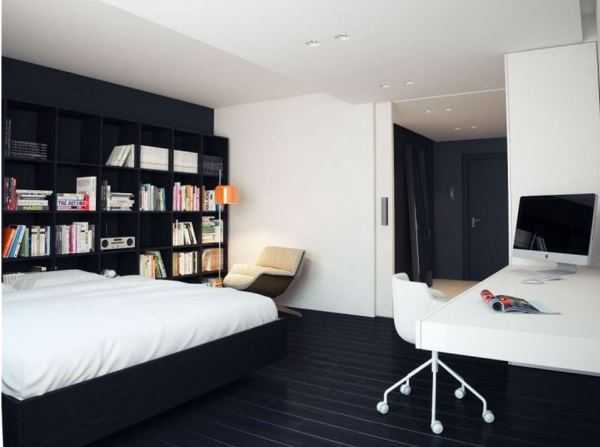 Желательно в маленькой спальне устанавливать такие стеллажи до потолка, она в таком случае зрительно будет выглядеть выше. Окрасив стену возле стеллажа контрастным цветом, вы подчеркнете его глубину и стильное оформление.