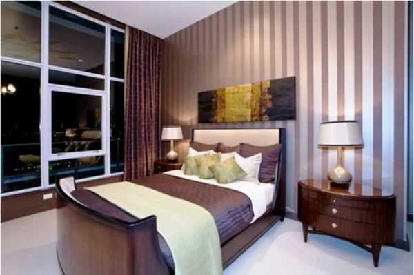 Полосатые обои вдоль всей высоты помещения – от пола до потолка также делают комнату выше и просторнее.