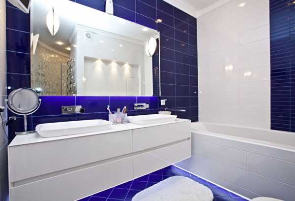 Как вариант – мозаичная плитка. И наоборот, наглядно уменьшить площадь большого помещения ванной комнаты можно с помощью крупной плитки, а также объемных рисунков на ней. - Не только визуально увеличить площадь такого помещения, как ванная комната – интерьер весьма интересный и необычный создать можно с помощью глянцевого натяжного потолка белого цвета, который к тому же, защищает от протечек сверху.