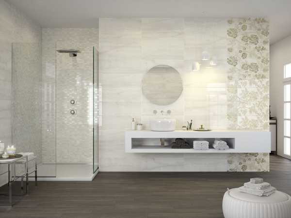 Керамогранит имеет большую площадь. Работать с ним легче, нежели со схожими материалами. Но стоит подготовиться к большим отходам. Оформить можно пол и стены идентичным оттенком и размером. Мозаика отличается долговечностью. Подходит для круглых участков, включая арку и выступ. Светлые тона наполняют помещение легкостью, прохладой и прозрачностью. Можно выбрать изделия, где сочетается несколько тонов одного цвета в разных вариациях.
