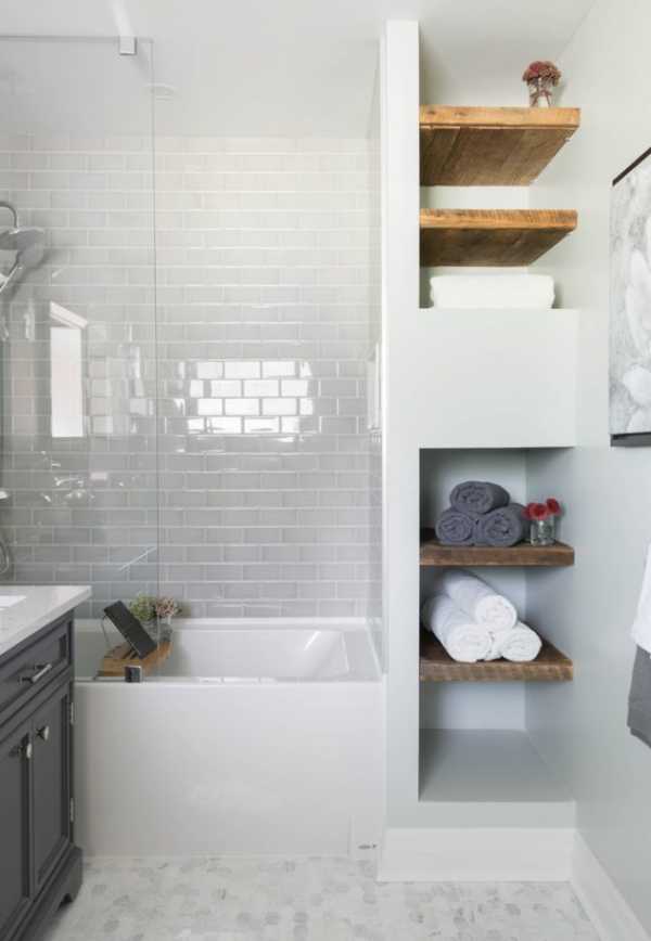 Верх сделайте белым, чтобы увеличить высоту стен. Для низа можно подобрать умеренно темный тон. Стеклянные полки отлично подойдут для маленькой ванны. Материал прекрасно переносит влажность и перепады температуры.
