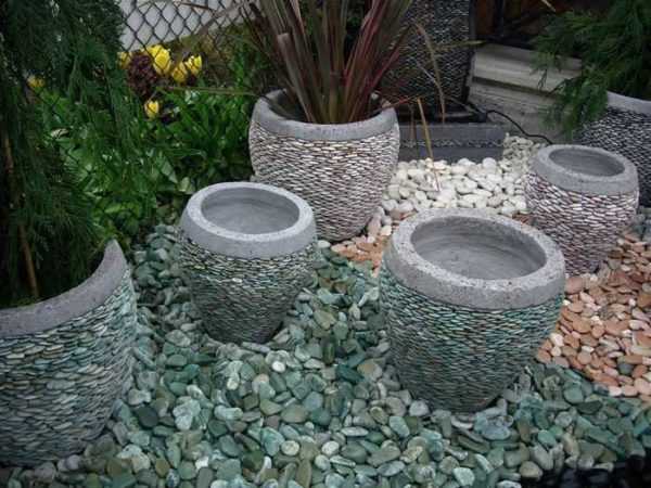 Вазоны для цветов из бетона, отделанные цветной галькой