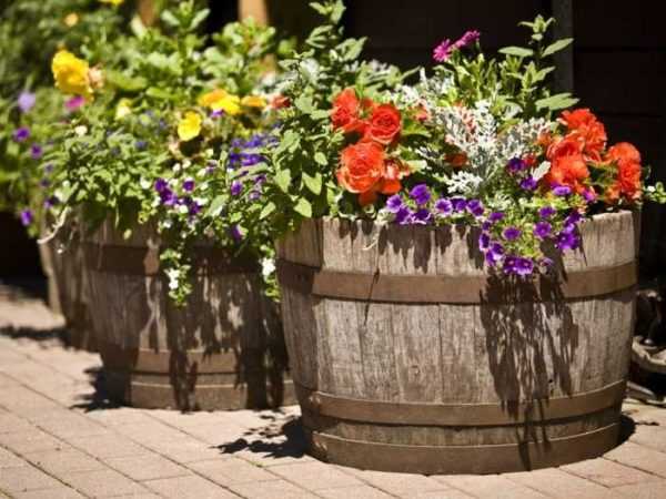 Бочки распиливают, причем в любой плоскости. Но если резать вдоль, придется сколачивать дощечки друг с другом. Разрезанные поперек бочки представляют собой два одинаковых (или почти) вазона.