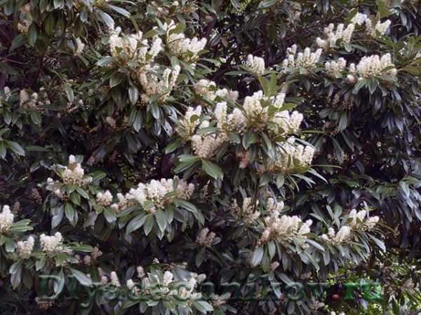 Непритязательный кустарник, чьи жесткие, темно-зеленые, блестящие листья похожи на листья лавра. Цветет весной мелкими белыми цветками, собранными в похожие на свечи соцветия.