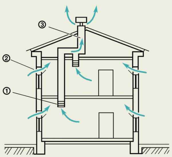 Схема вентиляции жилого помещения: 1 — вытяжная решетка, 2 — фрамуга или окно, 3 — вентиляционный канал.