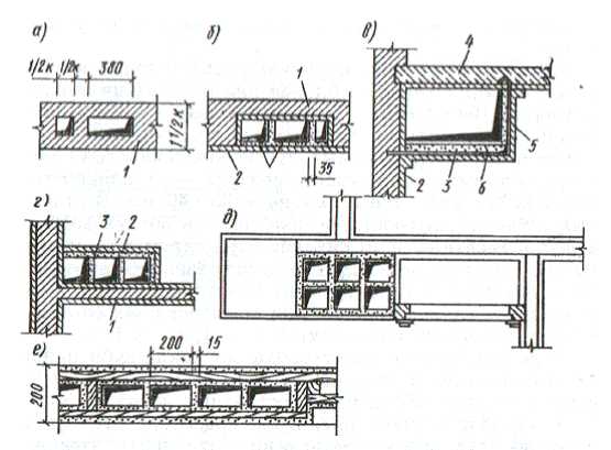 Конструкция вентиляционных каналов и воздуховодов: а — в кирпичных стенах; б — в бороздах стены, заделываемых плитами; в — подвесной воздуховод у потолка; г—приставные вертикальные каналы; д — компоновка каналов со встроенными шкафами; е — каналы из сухой штукатурки в перегородках; 1 — кирпичные стены; 2 — штукатурка; 3 — гипсошлаковые плиты; 4 — перекрытие; 5 — подвеска стальная; 6 — крепление (50х50х4 мм).