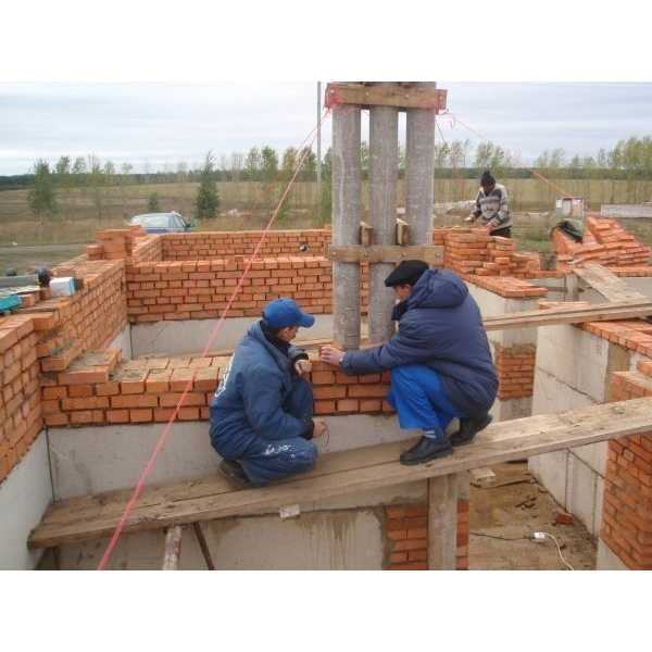 Перед укладкой кирпич увлажняется. Раствор накладывается на поверхность кладки и низ кирпича. Через каждые 6-7 рядов шаблон передвигается.