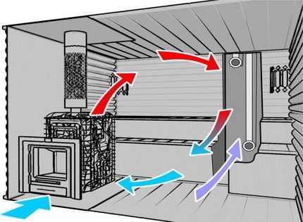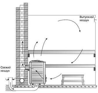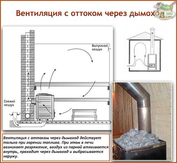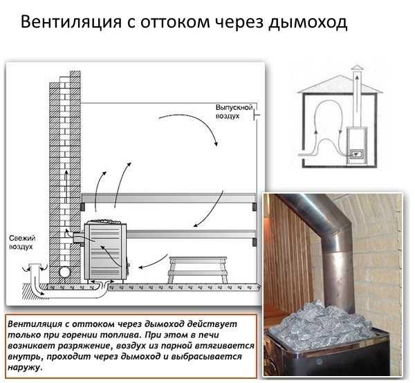 Печь-каменка с дымоходом может стать движущей силой вентиляции. При горении топлива отработанный воздух втягивается в печное поддувало и выходит через дымоход. Для того, чтобы осуществлялся приток свежего воздуха, делают щель около 5-10 мм в нижней части двери. Или же неплотно закрывают ее во время процедур. В банях-срубах, при горении огня в печи, воздух с улицы затягивается через неплотно подогнанные нижние венцы.